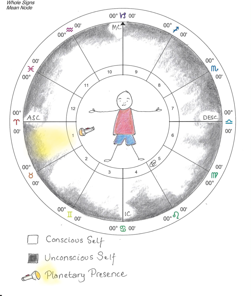 The planets travel counterclockwise around the astrological wheel most of the time, and it is almost as if they bring a really strong flashlight that shines on the parts of the chart they visit. When a planet passes through, it lights up what we are conscious of within ourselves, helping us see what we are already familiar with, perhaps from a different angle or with more depth and clarity.