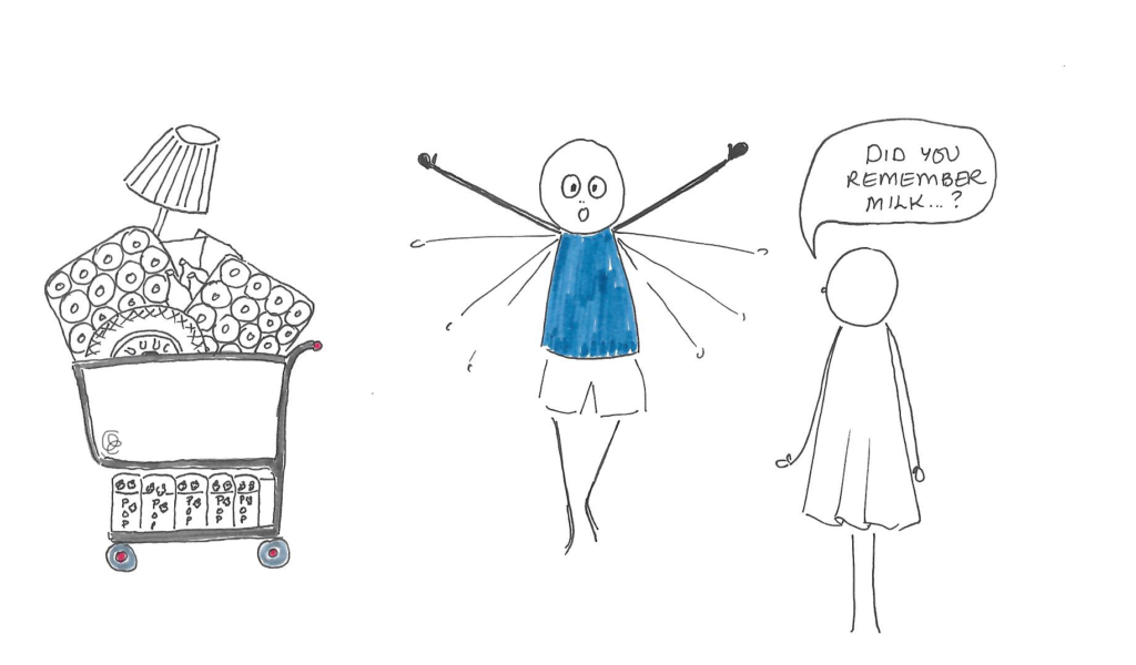 As I am writing this, one of the drawings I made in the very beginning of the pandemic came to mind. Perhaps you remember how feelings of insecurity and a lack of control led people to empty grocery store shelves, just to create a sense of imagined safety. As far as I remember, I never got around to publishing it then, but it expresses an emotional state that feels similar now.